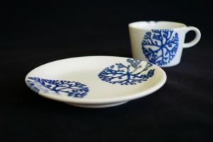The blue Mirumon pattern, dating from the Edo period and representing a seaweed, contrasts with the softness of the white typical of Takahama porcelain.